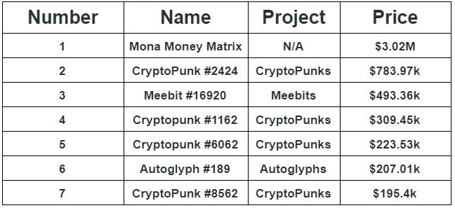 Mona Money Matrix가 최고가로 $3.02M을 기록했으며, CryptoPunk의 NFT들은 위의 리스트에 네 번이나 등장합니다.