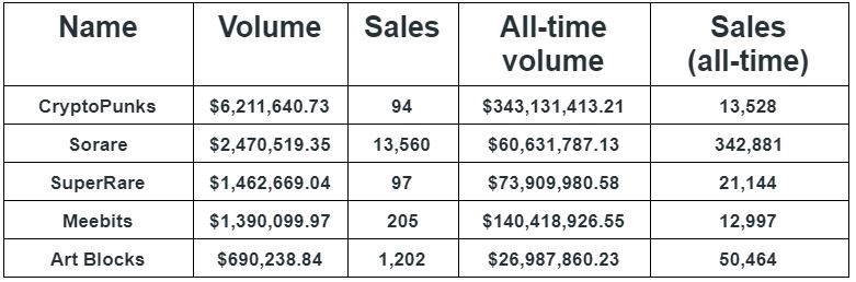 CryptoPunk가 총 판매액 $6.21m로 1위를 기록했으며, 판매량으로는 Sorare가 13,560건으로 1위를 차지했습니다.