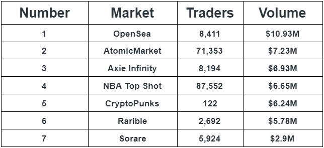 OpenSea가 총 판매액 $10.93M로 1위를 기록했으며, 트레이더 수에 있어서는 NBA Top Shot이 87,552명의 트레이더로 1위를 차지했습니다.