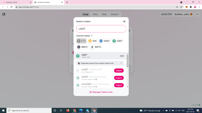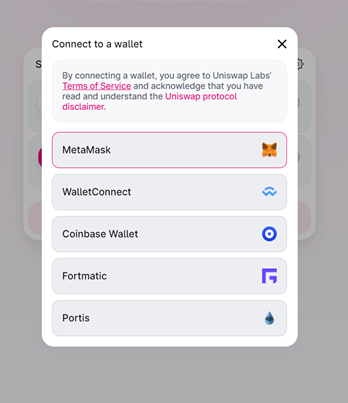 이제 당신은 DeFi 지갑을 연결할 수 있습니다. Uniswap은 MetaMask, WalletConnect, Coinbase, Fortmatic, 그리고 Portis만 호환 가능하다는 점에 유의하세요. 지갑 네트워크가 이더리움 네트워크로 설정되어 있는지 꼭 확인해야 합니다.