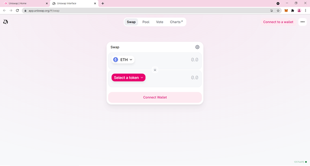 앱을 실행하면 스왑할 토큰 페어를 입력하는 옵션이 있는 교환 플랫폼이 나타납니다. 하지만 $XP를 얻기 전에 당신은 우선 지갑을 연결해야 하며, 이것은 우측 상단 코너의 ‘Connect to a wallet’ 버튼을 클릭해 진행할 수 있습니다.
