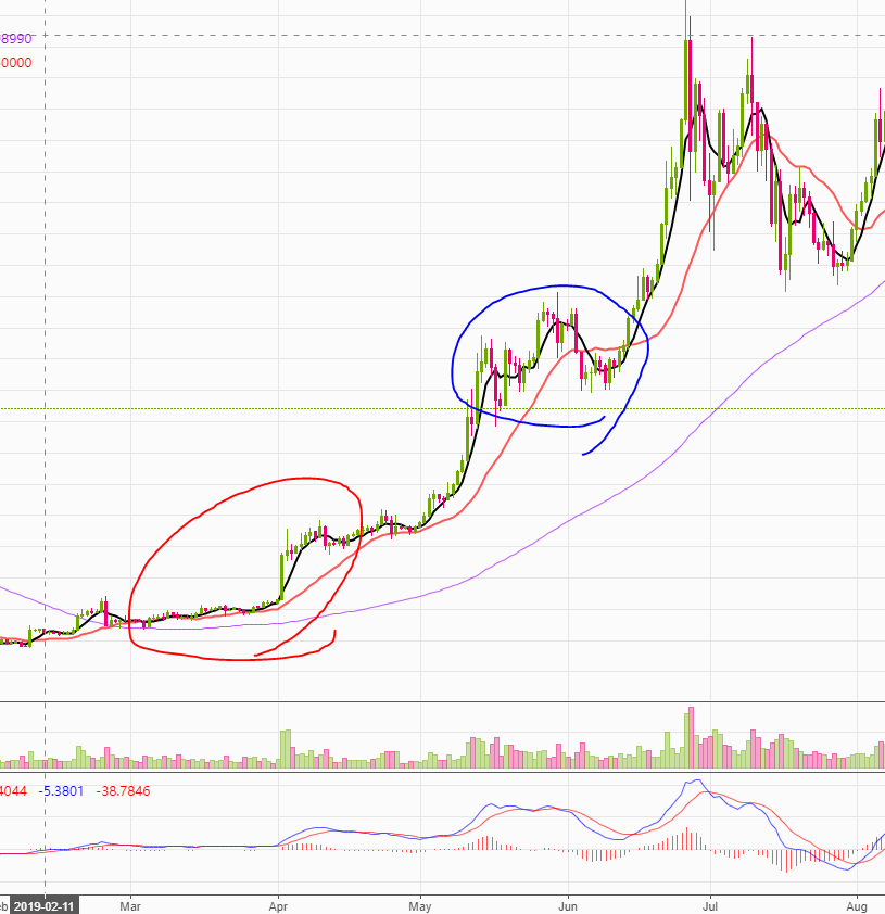 을 각각 나타내고 있으며 주황색 빨간색 원처럼 20일 선을 꾸준히 지지하며 이탈하지 않으며 꾸준히 상승세를 이어왔으며 파란색 동그라미에서 5일선이 꺾이고 생명선인 20일선에서 지지하지 못하고 다시 내 고려 가는 듯 보였으나 크게 이탈하지 않고 20일선을 돌파하며 상승 추세를 이어 간 것을 확인할 수 있습니다. 이처럼 20일 선으로 상승 추세일 때는 지지선이 었다가 하락 추세일때는 저항이 될 수도 있습니다. 이러한 부분을 보고 매매에 참고하여 여러분의 자산을 지키시길 바랍니다.