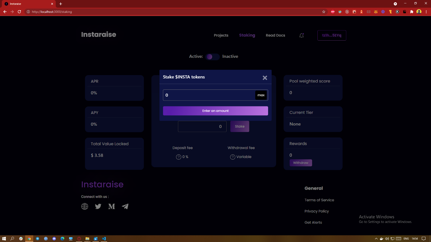 네이티브 $INSTA 토큰을 이용해 풀 가중치 평균 스테이킹 메커니즘 등을 통해 공정한 토큰 분배를 보장할 수 있는 두 라운드 IDO 구조 등의 고유 기능을 가진 플랫폼을 구축함으로써 Instaraise는 기존 런치패드들의 단점을 해결할 수 있었습니다. 2021년 Q3, 우리는 플랫폼 최초의 IDO를 개최하며 성공을 알렸습니다.